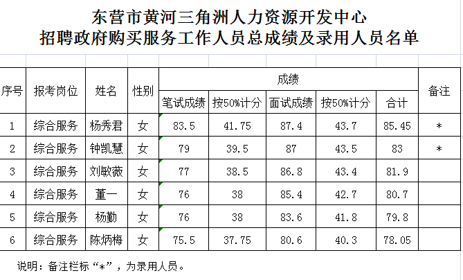 根據(jù)本次招聘活動的安排,現(xiàn)將進入面試人員的總成績及錄用人員名單予以公布。望被錄用人員按照統(tǒng)一規(guī)定和要求辦理相關(guān)錄用手續(xù)。